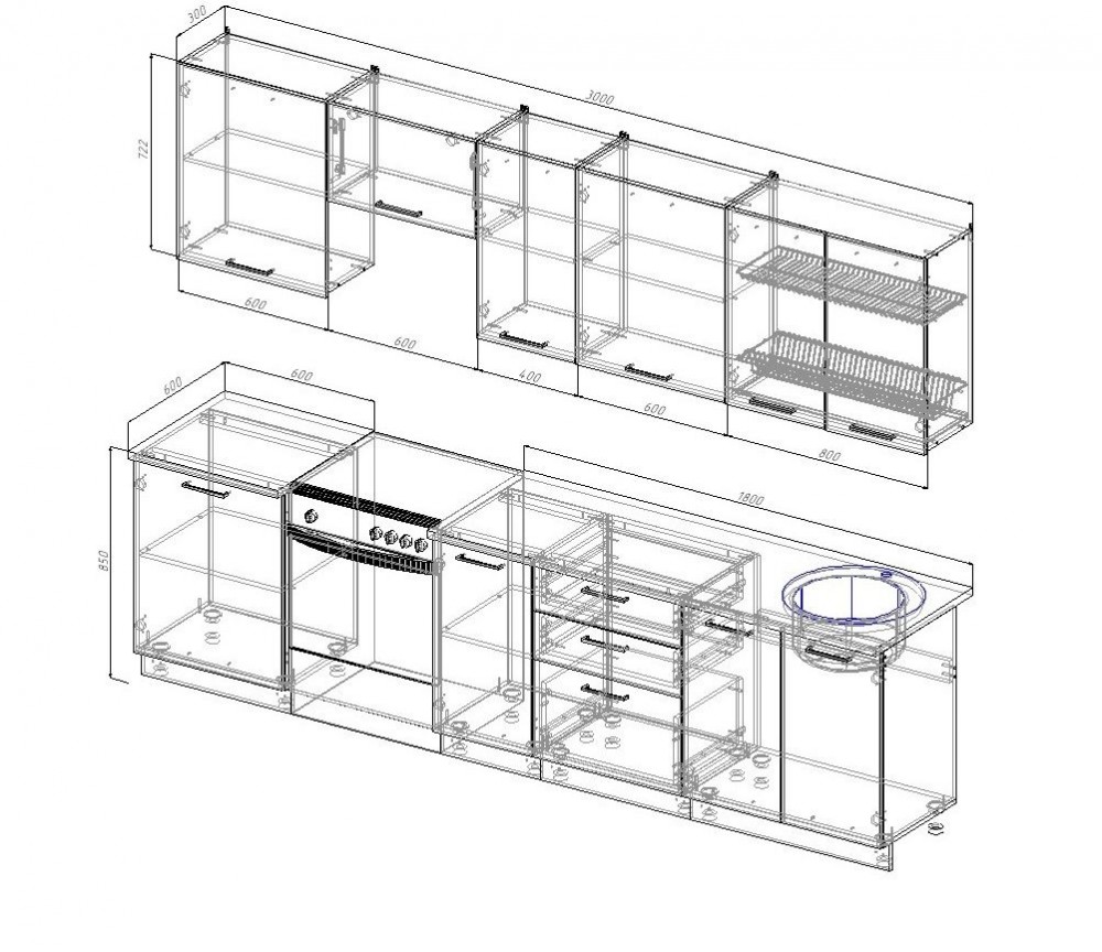 Фасады верхних модулей со свесом 12 мм дают возможность использовать без установки ручек.